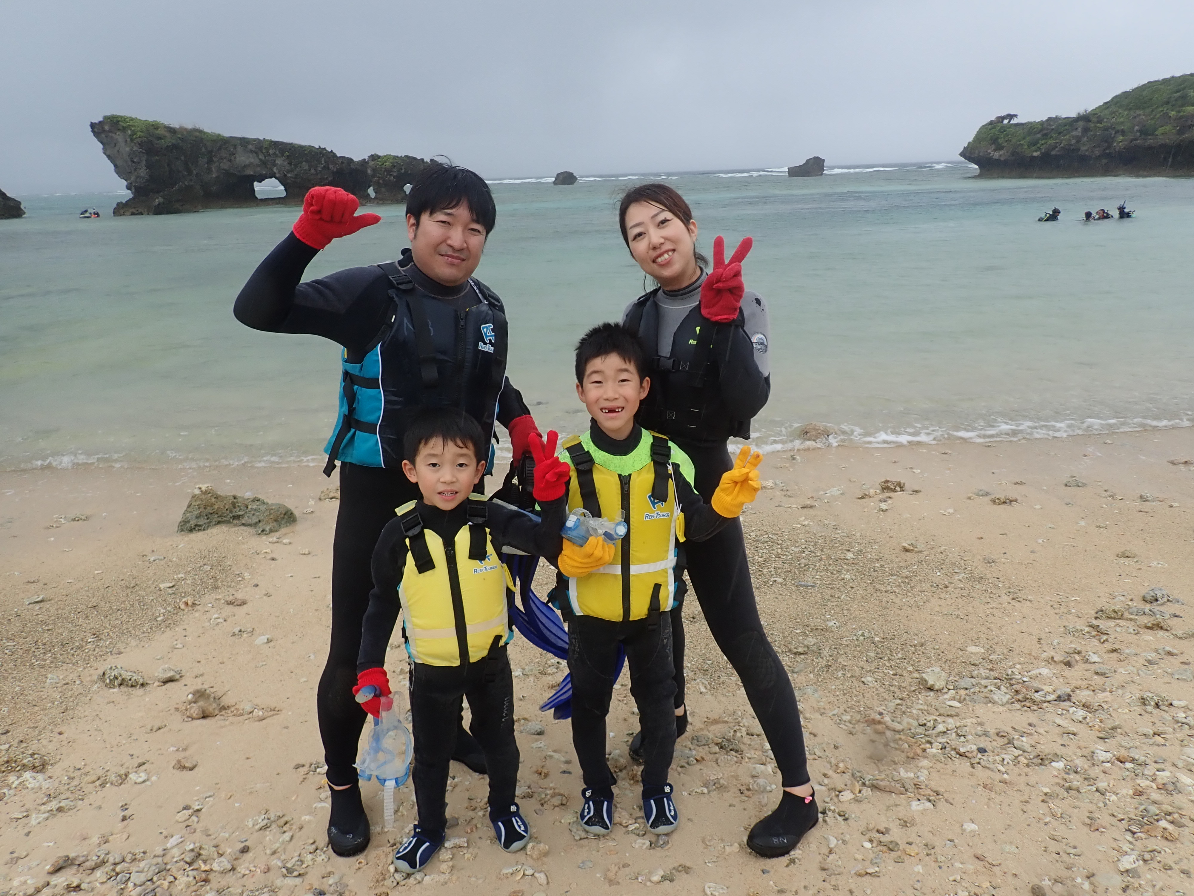 我們有旅遊行程在真榮田岬附近的沙灘.你可以在沙灘上看到珊瑚跟魚還有許多生物!事實上我們與這些生物互利共生所以大家都很開心